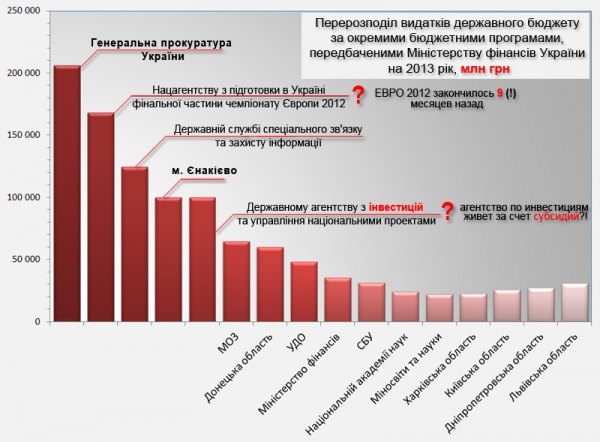 На першому місці в нашій державі — Генеральна прокуратура (206 млн), на другому – Євро-2012, який завершився ще 9 (!) місяців тому (168 млн), на третьому — Держслужба спецзв’язку (124 млн), на четвертому — рідне місто Віктора Януковича Єнакієвому (100 млн), а на п’ятому — Держагентство з інвестицій, яке, по ідеї, саме повинно залучати гроші в бюджет (100 млн). А далі дрібниці – по 60 млн на Донецьку область і МОЗ, 48 млн — на Управління держохорони, 35 млн — Мінфін, СБУ — 31 млн тощо. Після графіка — таблиця з точним зазначенням цифр у мільйонах гривень.